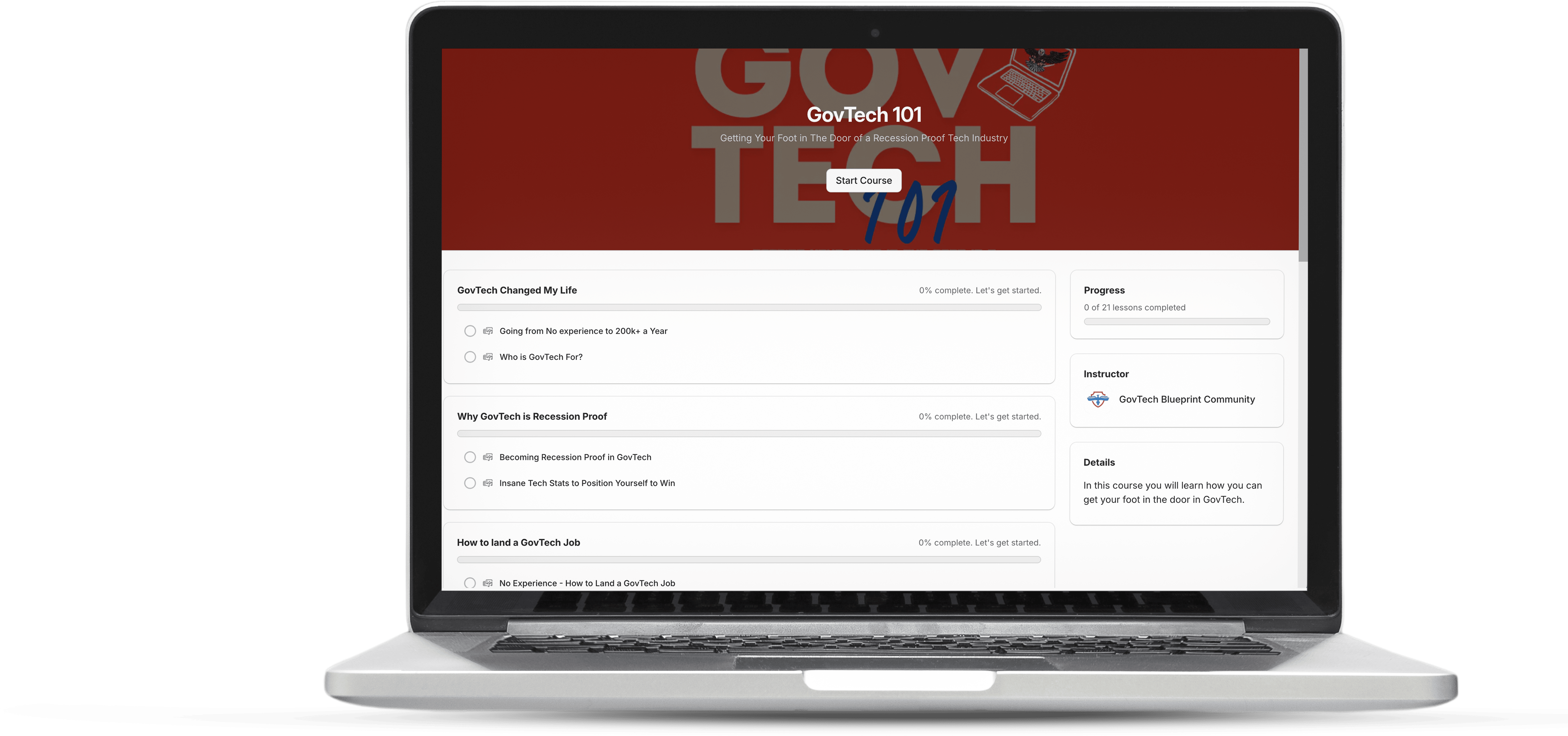 GovTech 101 is designed for career changers, military veterans, federal government employees, and government contractors looking to transition into or advance within the GovTech industry.